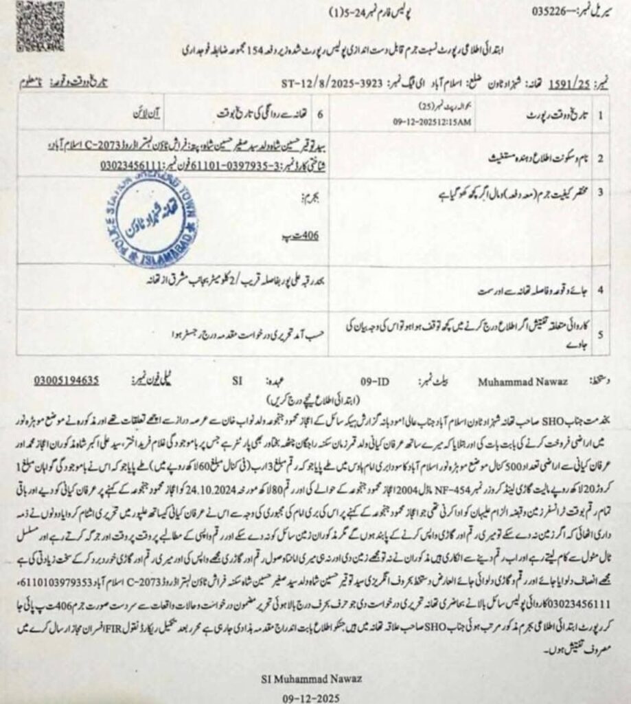 ڈپٹی پرائم منسٹر/وفاقی وزیر برائے خارجہ کے “نہایت ہی قریبی دوست” و خادم بری امام سرکار راجہ سرفراز اکرم کے بھائی را tvجہ حافظ اعجاز جنجوعہ خلاف 3 ارب روپے کے فراڈ پر مقدمہ درج مقدمہ اسلام آباد میں تھانہ شہزاد ٹاؤن میں مدعی سید توقیر حسین شاہ آف فراش ٹاؤن کی مدعیت میں درج کیا گیا