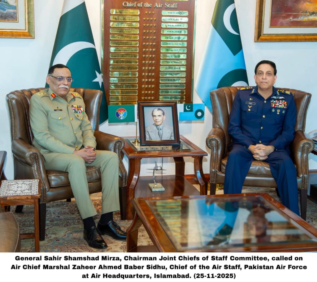 چیئرمین جوائنٹ چیفس آف اسٹاف کمیٹی کا ائیر ہیڈ کوارٹرز کا الوداعی دورہ25 نومبر، 2025: اپنی الوداعی مصروفیات کے جزویہ طور پر جنرل ساحر شمشاد مرزا، چیئرمین جوائنٹ چیفس آف اسٹاف کمیٹی، نے ایئر ہیڈ کوارٹرز اسلام آباد کا دورہ کیا۔ سربراہ پاک فضائیہ ائیر چیف مارشل ظہیر احمد بابر سدھو نے انکا استقبال کیا۔ ائیر ہیڈ کوارٹرز آمد پر پاک فضائیہ کے ایک چاق و چوبند دستے نے معزز مہمان کو گارڈ آف آنر پیش کیا۔ بعد ازاں، چیئرمین جوائنٹ چیفس آف اسٹاف کمیٹی نے سربراہ پاک فضائیہ سے انکے دفتر میں ملاقات کی۔ ائیر چیف مارشل ظہیر احمد بابر سدھو نے چیئرمین جوائنٹ چیفس آف اسٹاف کمیٹی کی مثالی خدمات اور تینوں مسلح افواج میں ہم آہنگی کو مضبوط و مربوط بنانے میں انکے اہم کردار کی تعریف کی۔ سربراہ پاک فضائیہ نے قومی دفاع کے لیے جنرل ساحر شمشاد مرزا کی نمایاں خدمات کو بھی سراہا اور دہشتگردی کی لعنت کے خاتمے کے لیے مسلح افواج کے ساتھ مل کر کام جاری رکھنے کے پاک فضائیہ کے غیر متزلزل عزم کا اعادہ کیا۔چیئرمین جوائنٹ چیفس آف سٹاف کمیٹی نے پاک فضائیہ کی جنگی تیاریوں، عملی مہارت، جدت طرازی اور اپ گریڈیشن کے اقدامات پر اطمینان کا اظہار کیا۔ انہوں نے پاکستان کی فضائی سرحدوں کی حفاظت میں پاک فضائیہ کے اہلکاروں کی پیشہ ورانہ مہارت و لگن کو سراہا اور دہشتگردی کے عفریت کے خلاف قومی جنگ میں پاک فضائیہ کے اہم کردار کا اعتراف کیا۔ انہوں نے پاکستان کی تینوں مسلح افواج کے مابین موجودہ ہم آہنگی کو بھی سراہا اور اس اعتماد کا اظہار کیا کہ یہ تعاون مستقبل میں مزید فروغ پاتا رہے گا۔ جنرل ساحر شمشاد مرزا نے پاک فضائیہ کی بھرپور حمایت پر ائیر چیف کا شکریہ ادا کرتے ہوئے پی اے ایف اور اسکی قیادت کے لیے نیک خواہشات کا اظہار کیا۔