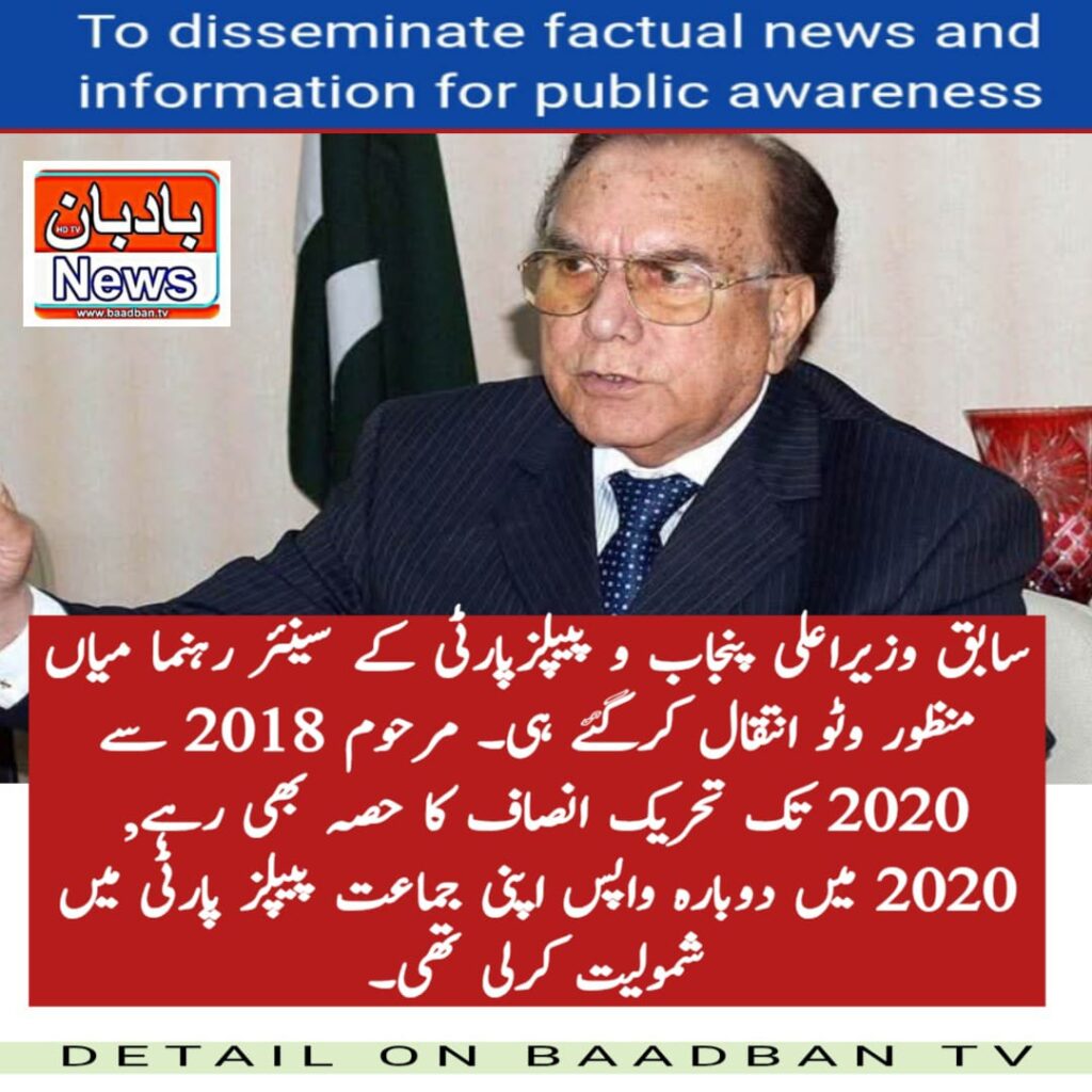 سابق وزیراعلی پنجاب و پیپلزپارٹی کے سینئر رہنما میاں منظور وٹو انتقال کرگئے ہی۔ مرحوم 2018 سے 2020 تک تحریک انصاف کا حصہ بھی رہے, 2020 میں دوبارہ واپس اپنی جماعت پیپلز پارٹی میں شمولیت کرلی تھی۔