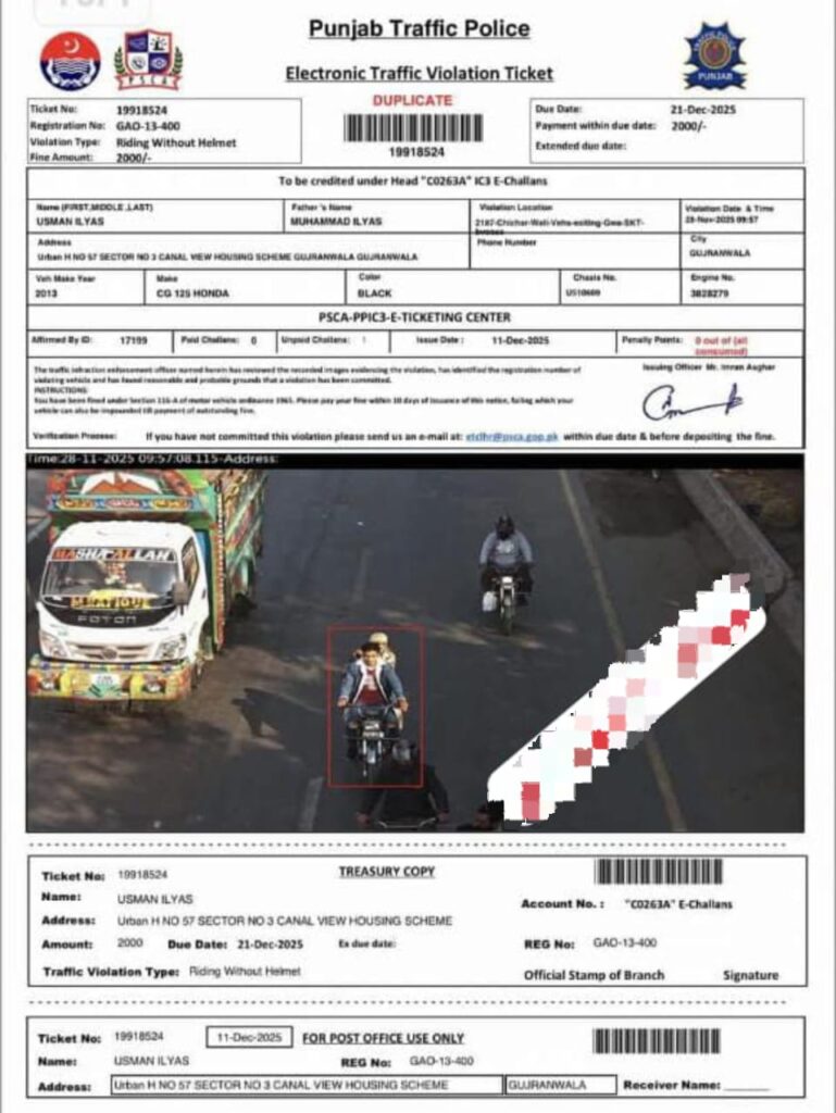 *نظام کی جھلک ملاحظہ فرمائیں!!!!* گوجرانوالہ میں 2013ء کے دوران ڈکیتی میں چھینی گئی سیاہ رنگ کی ہنڈا موٹرسائیکل کو پولیس آج تک برآمد نہ کرسکی ، لیکن E چالان سسٹم نے موٹرسائیکل کے اصل مالک عثمان کے گھر دو ہزار روپے کا چالان بھیج دیا۔ پولیس ریکارڈ کے مطابق یہ واردات اروپ کے علاقے میں ہوئی تھی اور تھانہ اروپ میں مقدمہ بھی درج ہے ، مگر ملزم گرفتار نہ ہوسکا۔ اس کے باوجود پنجاب سیف سٹی اتھارٹی نے عثمان کے نام 18 نومبر کا چالان جاری کر کے خبردار کیا ہے کہ اگر 25 دسمبر تک دو ہزار روپے جمع نہ کروائے گئے تو موٹرسائیکل ضبط کر لی جائے گی۔