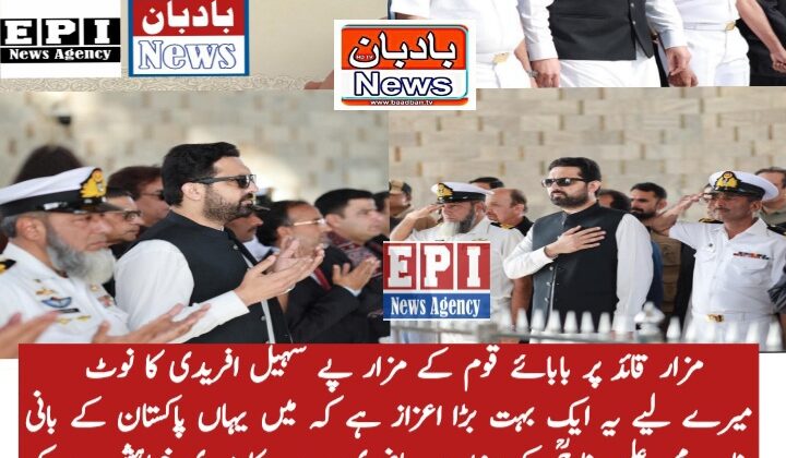 مزار قائد پر بابائے قوم کے مزار پے سہیل افریدی کا نوٹ میرے لیے یہ ایک بہت بڑا اعزاز ہے کہ میں یہاں پاکستان کے بانی جناب محمد علی جناحؒ کے مزار پر حاضری دے سکا میری خواہش ہے کہ تمام پاکستانی اُن کی تقاریر کو سنیں اور پاکستان کے تمام ادارے اُن ہدایات کے مطابق عمل کریں جو انہوں نے دی تھیں پاکستان زندہ باد