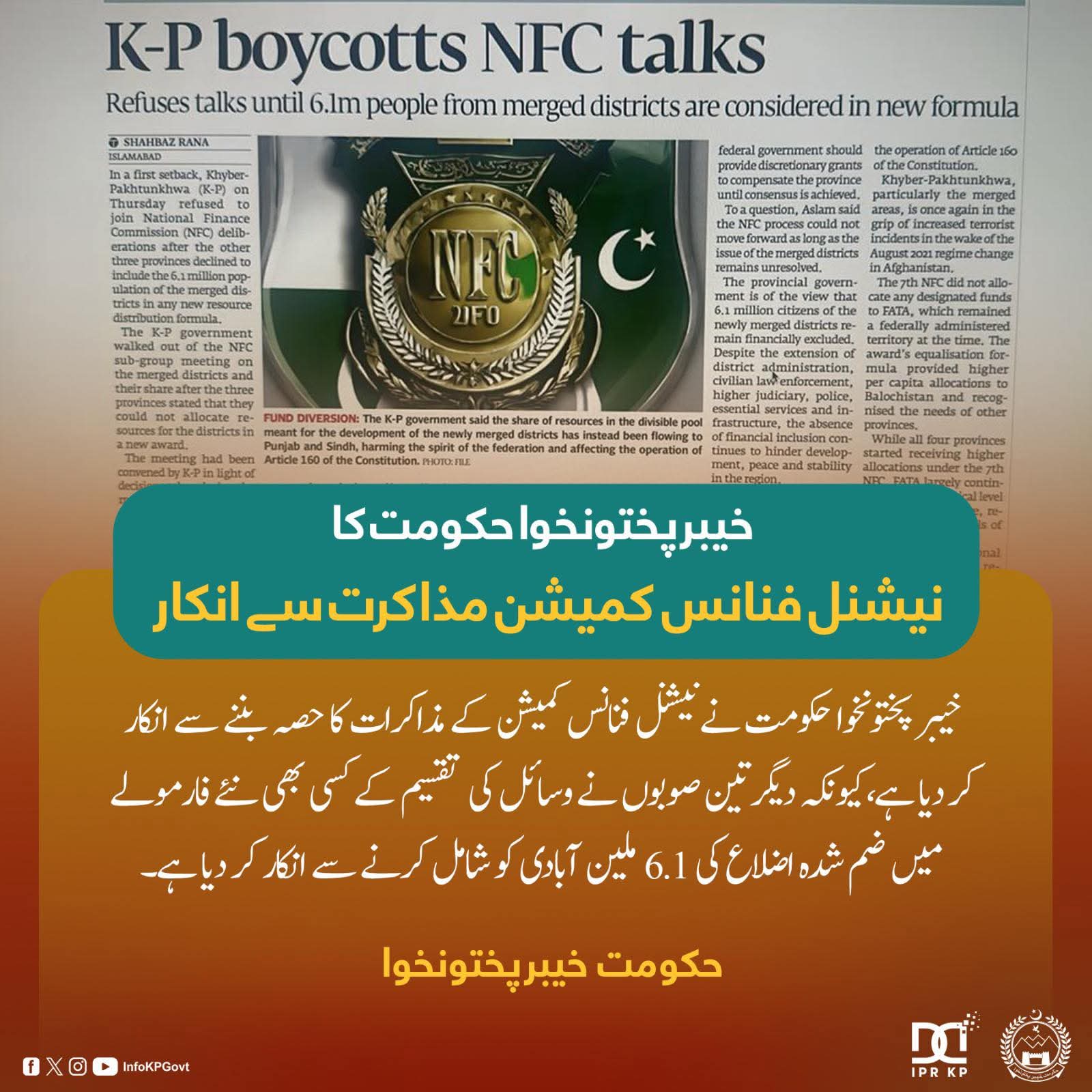 وزیراعلیٰ خیبرپختونخوا محمد سہیل خان آفریدی، وفاق کے غیر منصفانہ فیصلے کے خلاف ڈٹ گئے۔خیبرپختونخوا حکومت نے نیشنل فنانس کمیشن (NFC) کے مذاکرات میں شامل ہونے سے انکار کر دیا،...