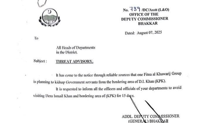 بھکر: سرکاری ملازمین کو تھریٹ الرٹ جاری ذرائع بھکر:فتنہ الخوارج گروپ سرکاری ملازمین کو اغواء کر سکتے ہیں ڈپٹی کمشنر بھکر:ڈپٹی کمشنر کی جانب سے نوٹیفیکیشن جاری بھکر:نوٹیفکیشن کے مطابق ملازمین ڈیرہ اسماعیل خان یا باڈر ایریاز میں غیر ضروری سفر سے اجتناب کریں ڈپٹی کمشنر