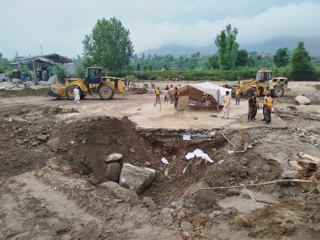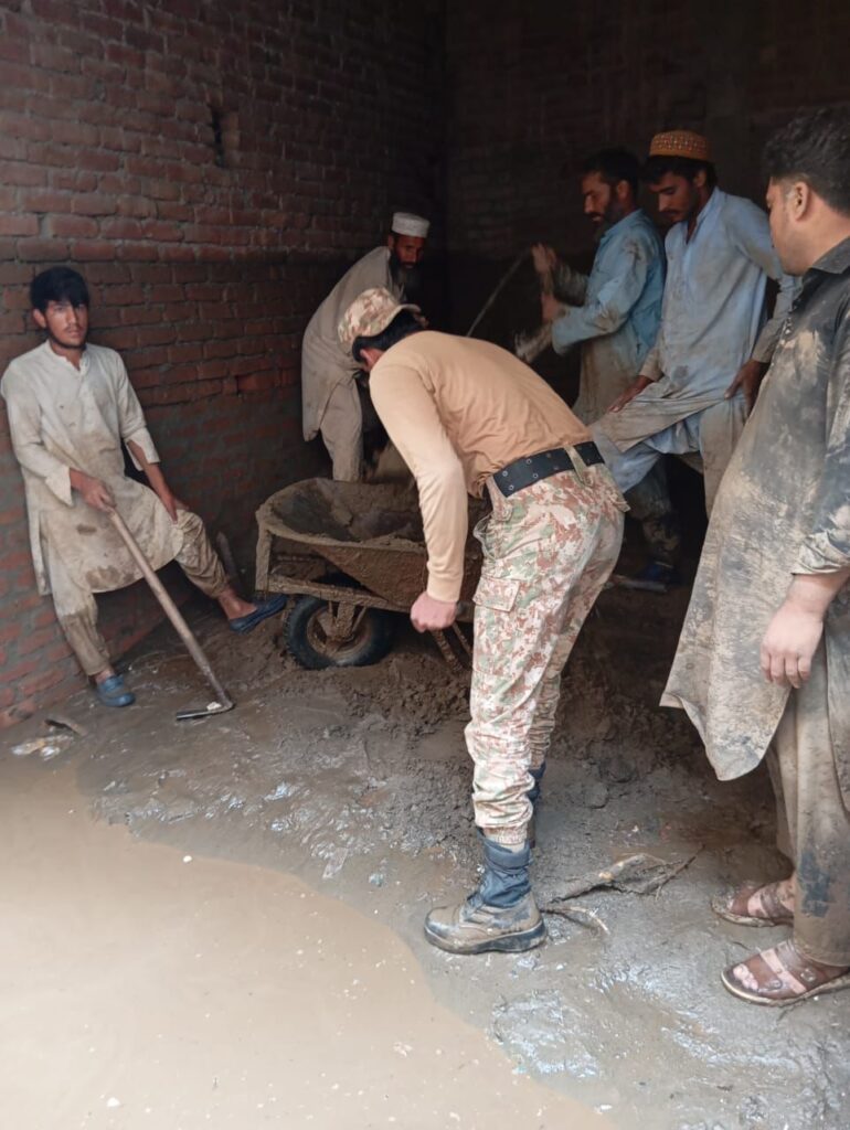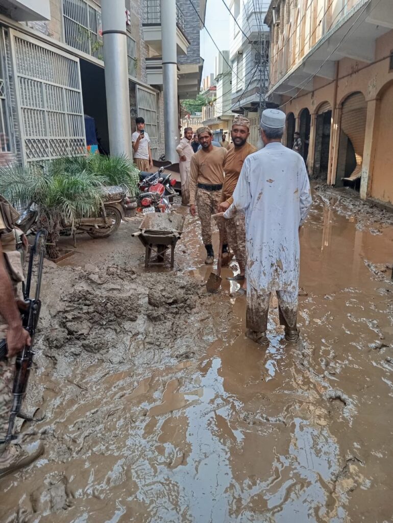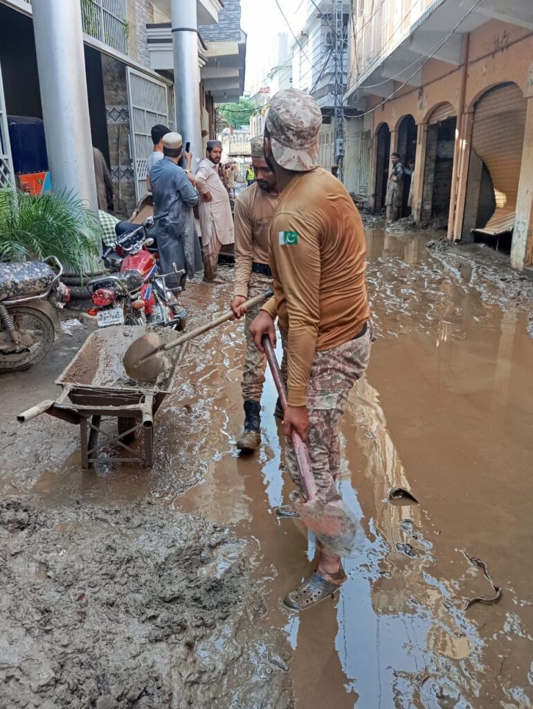 آرمی چیف فیلڈ مارشل سید عاصم منیر، ہلال جرات، نشان امتیاز (ملٹری) کی صوبہ خیبر پختونخوا میں سیلاب سے متاثرہ عوام کی بحالی سے متعلق خصوصی ہدایاتپاک فوج نے ایک دن کی تنخواہ خیبر پختونخوا کے سیلاب سے متاثرہ عوام کی بحالی کے لئے وقف کر دیپاک فوج نے اپنا ایک دن کا راشن جو تقریباً 600 ٹن سے زیادہ بنتا ہے، خیبر پختونخوا کے سیلاب سے متاثرہ عوام کی امداد کے لئے مختص کر دیاخیبر پختونخوا میں تعینات فوج سیلاب سے متاثر عوام کی بحالی میں بھرپور مدد کرے گی, سیکیورٹی ذرائع اس سلسلے میں اضافی فوجی دستے بھی بھیجے جا رہے ہیں، سیکیورٹی ذرائع آرمی چیف نے کور آف انجینئرز کو خصوصی ہدایات جاری کر دی ہیں کے پلوں کی مرمت کا کام جلد مکمل کرے، جہاں ضروری ہے عارضی پل قائم کیے جائیں، سیکیورٹی ذرائع آرمی کے نائن یونٹ کے ریسکیو سنیفنگ ڈاگ یونٹ کو بھی سرچ اینڈ ریسکیو کے لئے بھیجا جا رہا ہے، سیکیورٹی ذرائع آرمی کی خصوصی اربن سرچ اینڈ ریسکیو ٹیم بھی آرمی چیف کی ہدایت پر تعینات کر دی گئی ہے، سیکیورٹی ذرائع پاک فوج کے ہیلی کاپٹر اور آرمی آیویشن کو پہلے سے ہی خیبر پختونخوا کے سیلاب سے متاثرہ عوام کی بحالی کے لئے تعینات کر دیا گیا ہے، سیکیورٹی ذرائع