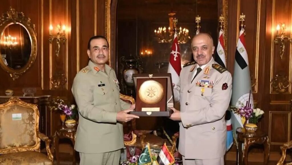 فیلڈ مارشل سید عاصم منیر، جمہوریہ مصر کے ایک اہم سرکاری دورے پر ہیں۔ اس دورے کا بنیادی مقصد دونوں برادر ممالک کے درمیان فوجی تعاون اور دفاعی اشتراک کو مزید فروغ دینا ہے۔اپنے دورے کے دوران، فیلڈ مارشل سید عاصم منیر نے مصری وزیر دفاع اور دفاعی پیداوار، جنرل عبدالمجید صقر اور مصری مسلح افواج کے چیف آف سٹاف، لیفٹیننٹ جنرل احمد خلیفہ فتحی سے ملاقات کی۔ان اعلیٰ سطحی ملاقاتوں میں باہمی دلچسپی کے امور، علاقائی سلامتی کی ابھرتی ہوئی صورتحال، اور دوطرفہ دفاعی تعاون کو مزید مضبوط بنانے کے طریقوں پر تفصیلی تبادلہ خیال کیا