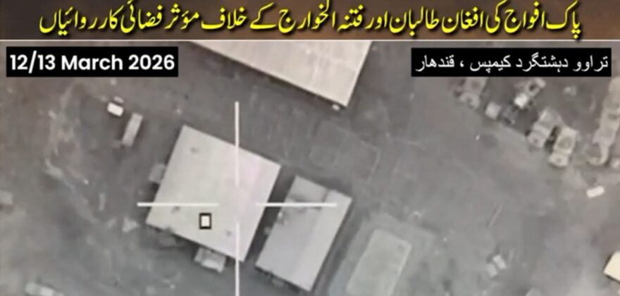 ، پاک افواج کے افغانستان میں کامیاب فضائی حملوں کی ویڈیو جاری*پاک افواج نے 12/13 مارچ کی درمیانی شب افغان طالبان اور فتنہ الخوارج کے دہشتگرد ٹھکانوں بشمول فوجی تنصیبات کو کامیابی سے نشانہ بنایا ، *سیکیورٹی ذرائع*ان حملوں میں پاک افواج نے قندھار میں تراوو (Tarawo) دہشتگرد کیمپس کو موثر انداز میں تباہ کیا ، *سیکیورٹی ذرائع*ان کامیاب فضائی حملوں میں صوبہ پکتیا میں شیرِناؤ دہشتگرد کیمپ کو بھی نشانہ بنایا گیا، *سیکیورٹی ذرائع**آپریشن غضب للحق کے تحت کارروائیاں اہداف کے حصول تک جاری رہیں گی*