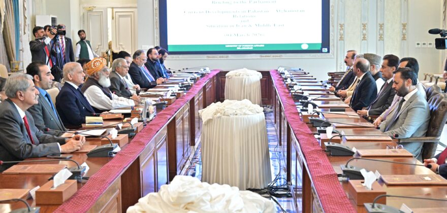 وزیر اعظم محمد شہبازشریف کی زیر صدارت پارلیمانی جماعتوں کے رہنماؤں و نمائندگان کا اجلاس*اجلاس کو پاکستان افغانستان صورتحال، ایران، مشرق و سطی و خلیج میں کشیدگی اور پاکستان کی سفارتی کوششوں کے حوالے سے ان-کیمرہ بریفنگ دی گئی