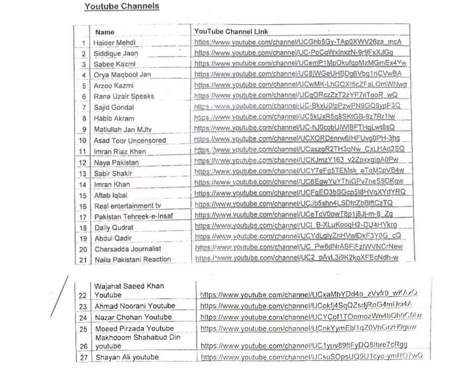 جن کے نام درج ذیل ہیں: 1. Haider Mehdi 2. Siddique Jan 3. Saeed Kazmi 4. Orya Maqbool Jan 5. Arzoo Kazmi 6. Raza Uzair Speaks 7. Sajid Gondal 8. Habib Akram 9. Matiullah Jan MJtv 10. Asad Toor Uncensored 11. Imran Riaz Khan 12. Naya Pakistan 13. Sabir Shakir 14. Imran Khan 15. Aftab Iqbal 16. Real Entertainment TV 17. Pakistan Tehreek-e-Insaf (پی ٹی آئی کا آفیشل یوٹیوب چینل) 18. Daily Qudrat 19. Abdul Qadir 20. Charsadda Journalist 21. Naila Pakistani Reaction 22. Wajahat Saeed Khan 23. Ahmad Noorani 24. Nazar Chohan 25. Moeed Pirzada 26. Makhdoom Shahabud Din 27. Shayan Aliعدالت سے درخواست کی گئی ہے کہ یوٹیوب کی مرکزی کمپنی “Google LLC, D/B/A YouTube, 901 Cherry Ave, San Bruno, CA 94066, USA” کو ان چینلز کی بندش کے لئے subpoena / warrant جاری کیا جائےسرکاری مؤقف:درخواست پر سائبر کرائم سینٹر اسلام آباد کے سب انسپکٹر ایم وسیم خان کے دستخط ہیں جنہوں نے عدالت سے اپیل کی ہے کہ ان چینلز کی بندش ریاستی سلامتی، سماجی ہم آہنگی اور قانون کی بالادستی کے لیے ضروری ہے۔حکومت کی جانب سے اس اقدام کو سوشل میڈیا پر ریاستی رٹ قائم کرنے کی کوشش کے طور پر دیکھا جا رہا ہے، جبکہ سادہ ترین الفاظ میں اسے اظہارِ رائے کی آزادی پر مارشل لائی حملہ قرار دیا جائے تو بھی کم ہے ۔