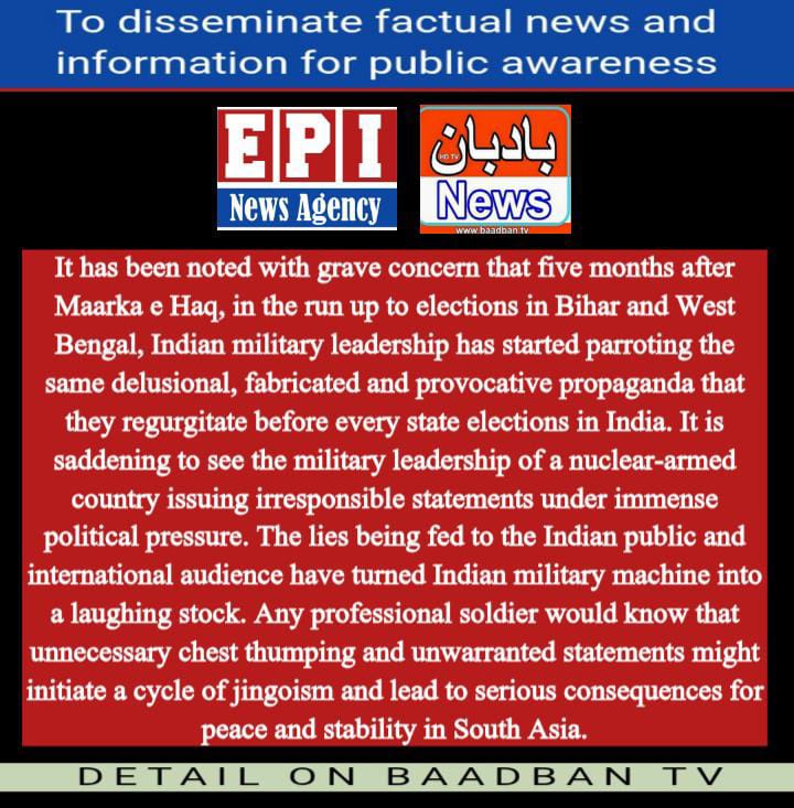 بھارتی فوجی قیادت کا من گھڑت، اشتعال انگیز پروپیگنڈہ دہرانا انتہائی تشویشناک ہے۔آئی ایس پی آر کا کہنا ہے کہ بہار اور مغربی بنگال کے انتخابات کے پیش نظر بھارتی نے یہ پروپیگنڈہ دہرانا شروع کیا، ایسا لگتا ہے بھارتی فوج اور اسکی سیاسی قیادت معرکہ حق کی شکست تسلیم نہیں کر پائی۔پاک فوج کے شعبہ تعلقات عامہ کا کہنا ہے کہ بھارتی فوج اس حقیقت کو ہضم نہیں کر پائی کہ انہیں معرکہ حق میں فیصلہ کن شکست ہوئی، بھارت کی جھوٹ کی پرتیں بے نقاب ہو چکی ہیں، دنیا اب بھارت کو سرحد پار دہشتگردی کا اصلی چہرہ اور علاقائی عدم استحکام کا مرکز مانتی ہے۔آئی ایس پی آر کے مطابق بھارت اپنے عوام اور پڑوسیوں کے مفاد کے منافی مہم جوئی اور بالادستی کی پالیسیوں پر اڑا ہوا ہے، پاکستانی عوام اور افواج اپنی دھرتی کے ہر انچِ کے دفاع کے لیے پوری صلاحیت اور پختہ عزم رکھتے ہیں۔شعبہ تعلقات عامہ کا کہنا ہے کہ بھارتی مسلح افواج اور اس کے سیاسی آقاؤں کو پاکستانی صلاحیت اور عزم کو سمجھ لینا چاہیے، ہر جارحیتی اقدام کا جواب تیز، پختہ اور بھرپور انداز میں دیا جائے گا،جو اگلی نسلیں یاد رکھیں گی۔پاک فوج کے شعبہ تعلقات عامہ کے مطابق بھارتی عوام اور بین الاقوامی برادری کو جھوٹ باور کروائے جا رہےہیں، ہرپیشہ ور فوجی جانتا ہوگا کہ غیرضروری گھمنڈ اوربےجا بیانات جنگی جنون بڑھا سکتےہیں، ایسےعمل سے جنوبی ایشیا میں امن و استحکام کو سنگین نتائج کا سامنا کرنا پڑسکتا ہے۔